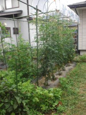 今朝もキュウリ2本とミニトマトの収穫をしました。今年は例年になくトマトのなりがいい。桃太郎も順調に育っています。ミニトマトはわき芽も伸ばしているのでボウボウと上に伸びています。天井にビニールを張ってやったのが功を奏しているようです。トマトの後ろにはキュウリが。こちらも順調に収穫をさせてもらいましたが、そろそろ終焉に近づいるようです。辛ナンバンが辛くないのが予定外でした。