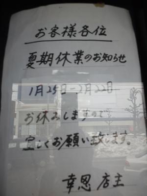 昨日、事務所の道路向かいにある幸恩に行きました。「今週末飲み会があるので電話したがつながらないので見てきて」という妻の指示に従ったもの。確かに電気はついていないのですが玄関まで行ってみると張り紙がありました。1/25〜2/22まで休みになることが書いてあります。お国帰りでしょうか。タイトルには「夏季休業のお知らせ」と。漢字の苦手な彼女は日付だけを切り張りしたのでしょう。