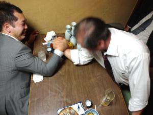 先週の金曜日、当社トレーニングルームにて研修会が行われました。お客様に納得してもらえる医療保険の提案方法、退職金の3大メリットの活用方法について。終了後みんなで食事に行きました。仕事の話をしながら食事も進んだ頃、一人が「腕相撲は負けたことがない」と。腕相撲に関しては私もいささか経験者。テーブルの上を片付け場は腕相撲大会会場に。相手は思いのほか強く3戦3敗でした。