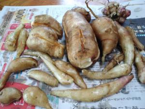 昨日、実家の畑の隅に植えていたヤーコンを掘り出しました。知人に頂いた苗を植えてみたもの。初めての収穫です。茎を引っ張ると造作なく全ての実が出てきました。実のつき方は里芋のようでもありシャキシャキした実は大根ようでもあります。掘出し時期が少々遅かったのか実にヒビが入っていましたが食するに影響なし。豚肉とコリアンダーで炒めてみました。なかなかの食材であることを知りました。