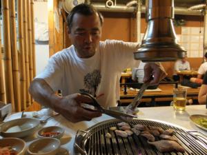 初日の夜に行ったのはガイドブックで目をつけていたテブチャンという焼肉の店。地下鉄3号線に乗り336番の駅でおり、4番出口から出たところで右に曲がり、あとは地図やガイドブックを見ながら写真の看板の色やハングル文字の形を探しながら10分ほど歩いたところで発見。人気の店らしく店内は勤め帰りの韓国の人たちでいっぱい。一頭の豚から200gしか取れないという稀少部位のモクハンジョン(首と肩の間の部位)やサンギョプサルを注文。炭火で焼きミソやニンニクをたっぷりつけて食べます。これぞ本場の焼肉!!ビールもうまい!!お隣には韓国の若い女性3人が座っていましたが、その食べっぷり飲みっぷりには脱帽。