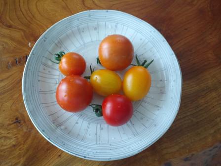 収穫したトマトは水洗いして朝食のテーブルに。6個とれた場合は妻が2個食べるあいだに私が4個を食べているらしい。