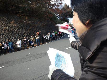 私の左隣に来たオジサンは脚立にのぼり、選手一人一人の写真を撮っていました。小涌園の旅館の関係者のよう。やたら詳しい。5区の選手のリストを周りの人に配っていました。右隣にいたオバサンは毎年来ているよう。こちらも詳しい。もらったリストを見ながら「リュウジ」「コウダイ」と大きな声で応援していました。箱根駅伝は観客もなかなか見所があります。