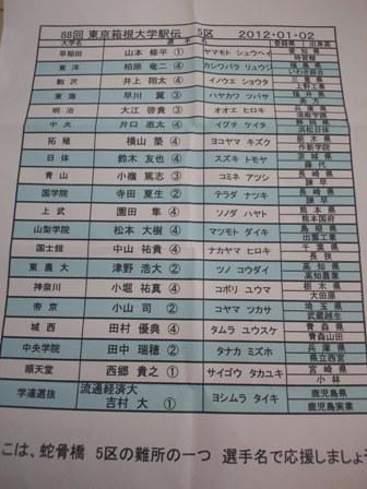 左隣のオジサンが配っていた5区のランナーのリスト。ここは蛇骨橋というところ、難所の一つであるらしい。