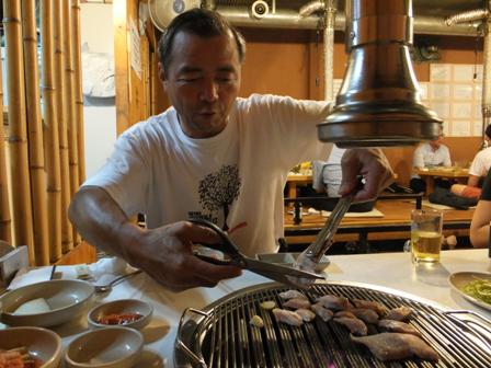 初日の夜に行ったのはガイドブックで目をつけていたテブチャンという焼肉の店。地下鉄3号線に乗り336番の駅でおり、4番出口から出たところで右に曲がり、あとは地図やガイドブックを見ながら写真の看板の色やハングル文字の形を探しながら10分ほど歩いたところで発見。人気の店らしく店内は勤め帰りの韓国の人たちでいっぱい。一頭の豚から200gしか取れないという稀少部位のモクハンジョン(首と肩の間の部位)やサンギョプサルを注文。炭火で焼きミソやニンニクをたっぷりつけて食べます。これぞ本場の焼肉!!ビールもうまい!!お隣には韓国の若い女性3人が座っていましたが、その食べっぷり飲みっぷりには脱帽。