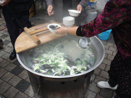 焼きかきコーナーの隣では、ムール貝の塩汁。これまた格別でした。