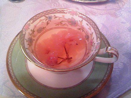 昨日はお客様宅にて夕食をごちそうになりました。ピアノとオオボエの生演奏つきという贅沢なもの。オオボエの原型はあのチャルメラなのだと。確かにまっすぐに音が迫ってくるようでした。40分ほど演奏を聴いたでしょうか。大変いい気持ちになったところで、奥様の手作りフルコースをいただきながら花見の話しやペットの話で盛り上がりました。最後に出された桜茶の花もまた茶碗のなかで満開でした。