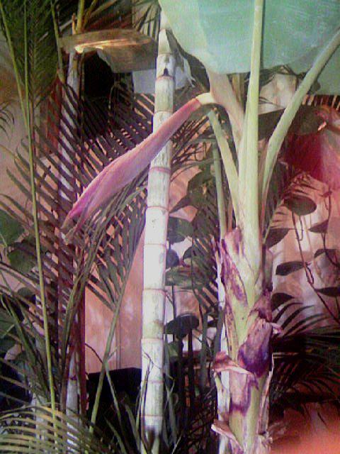 昨日お伺いしたお客様の家の中央には熱帯系植物を育てている部屋があります。インドネシアチークを使ってバリ島風に彫刻を施したドアを使用しており通称「バリの間」と呼んでおられます。今年はそこに植えているバナナが花を咲かせそうだとのこと。高さ4〜5mほどに育っているバナナの木の葉っぱの付け根から確かにニョキッと30cmくらいの赤っぽいバナナの花のつぼみが飛び出していました。