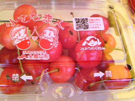 昨日、山形観光物産館に立ち寄りました。入口の八百屋さんの棚にはパック詰のさくらんぼが並べられてありました。「割果」と書かれています。さくらんぼの先端に割れがあるために安くしているとのこと。1パック1,000円。「買えないけど写真だけ撮らせてもらいます」と言って一枚撮ると、ニッコリ笑っておじさんが「中にもっといいのがあります」と。1パック5,000円のきれいなさくらんぼがありました。
