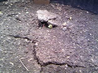 今朝プランターをのぞいて見ると表面の土が地割れを起こしています。よく見ると割れた土の下から芽が出てきています。5月4日に二十日大根を植えたのでした。上にかけた土が少々多かったのでしょう。みんなで土の帽子を持ち上げているかのようです。畑に植えようとポットに植えたゴーヤの種はまだ芽を出していません。
