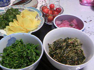 昨日お伺いしたお客様ではいろいろな手作りのお茶置きを出してくれました。手前左は菜の花の新芽とのこと。菜の花の花を咲かせないで新芽が出たらそれをつんでおくといつまでも新芽が出続けるのだそうです。あと一ヶ月は食べられるそうです。手前右側は水菜の煮物。これもなかなかおいしい味でした。一通りご馳走になったところで味付け卵が出てきました。ほぼ定食をいただいている感じでした。