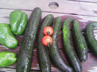 今朝、我が家の畑から野菜の収穫をしました。畳4枚ほどの畑ですがいろいろな実をつけ始めています。キュウリは不ぞろいですが6本ほど大きくなっていました。今年の初もぎです。パプリカは赤と黄色を植えています。まだ緑色ですが小さな木に不似合いな大きさになっていたので採りました。二十日大根や玉ねぎなど周りにあった野菜と混ぜ合わせて浅漬けの元を入れ漬物にしたところです。