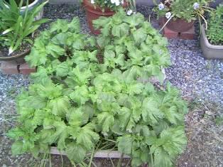 チューリップのプランターから生えてきたシソがだんだん生長しています。密生を防ぐため時々2〜3本を抜いては食料に使っていますが、それでも成長の速度は速くプランターいっぱいに葉っぱを開いています。まだ引き取り手がいません。ご希望の方には無料進呈いたします。