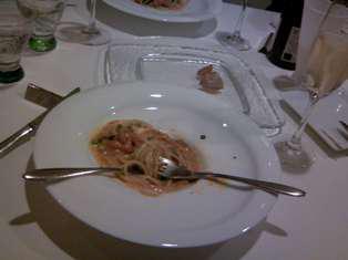 先日の月曜日、当社の忘年会が行われました。昨年開店したお客様のお店にお伺いしました。魚や肉の料理とワインをおいしくいただきました。最後に出てきたのはウニパスタ、たまらずもう一本ワインを頼んだのでした。写真を撮るのを忘れていて食べかけのパスタを一枚。6:30に入って出てきたのは10:30頃、食事と会話で随分長居をしてしまったようです。