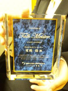 2月に開催されました日新火災のトークコンテストにおいて当社社員が全国優勝をしたという記事が業界紙に載りました。それらを見ていろいろな人がやってきます。昨日も以前の勤め先で担当していたという保険会社の人がお祝いにやってきました。いろいろと反響があるようです。先日、そのコンテストに出場した人に贈られるトークマイスターの楯が届けられました。昨年私が取りそこなったものです。