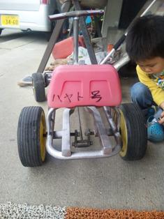 昨日お伺いしたお客様には孫さんのための手動自動車がありました。廃品として処分されようとしていたのをもらい受け、修理をして使えるようにしたそうです。座席に座りハンドルを前後に動かすとクランクが回転し後輪をまわすというしくみ。はじめは動かせなかったのですが3日で使えるようになったそうです。自動車の名前は「ハヤト号」。孫さんは「オイルは大丈夫かな?」と言って点検していました。