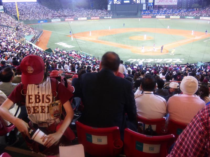 昨日は友人とクリネックススタジアムで野球の観戦をしました。日新火災のご招待シートを利用。楽天は田中将大、ヤクルトは2年目仙台育英出身のヨシノリの先発という好カード。観客も楽天を応援しながらも「ヨシノリおちつけ!」と交互に入り混じった声援。一点を先制されたヤクルトが8回にピッチャーを変えた瞬間、球場は一気に楽天応援が爆発。田中の気合の入った6勝目を見させてもらいました。