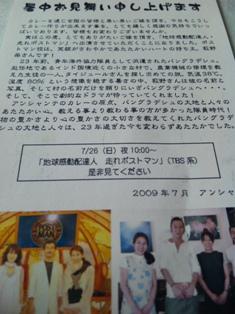 昨日、友人から暑中見舞いが届きました。彼は長野県駒ヶ根市でバングラカレーの店を経営しています。そのハガキによると、TBS系テレビで放映されている「走れポストマン」に出演することになったとのこと。放送は7/26PM10時。23年前、青年海外協力隊としてバングラデシュに派遣され農業機械の指導をしました。その時の生徒に手紙を届けるというもの、劇的なドラマが待っていたそうです。