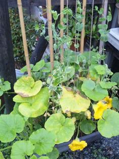 6月頃、妻が「ツタンカーメンの豆」というものをもらってきました。「ツタンカーメン」というからには何か特別なものに違いないとプランターに植えたところ、豆の苗と同時に大きな葉っぱが出てきました。まるでカボチャのような。なるほど変わった豆だと思いながら育てていましたが、最近となりのカブのプランターからもその葉っぱが出てきました。どうやら植えた土にカボチャの種が入っていたようです。