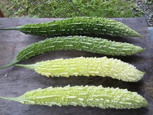 今朝、庭の畑を見ると白っぽいゴーヤが一本成長しているのが見えました。初物の収穫をと思い畑に入ると、その他にも大きくなっているゴーヤがあることを発見。4本の収穫がありました。やや細めですが30cmほどに伸びていて食べごろ。2本はお隣におすそ分けした後、さっそく薄切りにしたものを軽くゆでてマヨネーズをかけて朝食にいただきました。さわやかなとりたての苦味はまさに夏の味です。