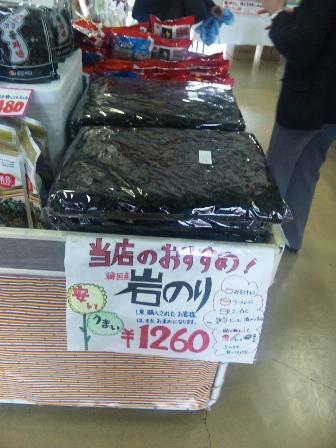昨日の日曜日、戸沢村中央公民館まで行きました。妻の業務のためなのですがドライバーとして指名されたもの。途中で道の駅「高麗館」に立ち寄りました。店に入るとすぐに「当店のおすすめ」と書かれた岩のりがありました。大きさはまるで座布団。値段が1,260円というのにもビックリ。さっそく一枚購入。その日の夜、味噌汁に入れて食べたのですが味はなかなかいい。「高麗館」のおすすめ品です。