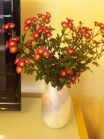 昨日お伺いしたお客様は定年退職して2年になられます。定年後に畑を購入し野菜や花の栽培をしておられるそうです。秋になると山からかなりの量の落ち葉を拾ってきて腐葉土を作るらしい。花の季節には家中が花いっぱいになるとのこと。居間のテレビの脇に「今年最後の花だ」と、寒菊が飾られていました。