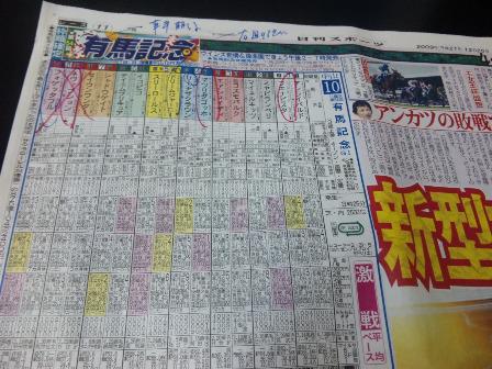 昨日の日曜日は一日中事務所で仕事をしました。でも中一時間だけテレビにかじりつきました。有馬記念です。初めて馬券を買いました。2,000円だけですが。買い方はわからず友人に依頼して買ってもらいました。これまでは訳のわからない馬の名前が連呼されているだけだと思っていたのですが、馬券を買ってみるとそれらの馬の名前にビンビンと反応するから不思議です。結果はおしかったのですが。