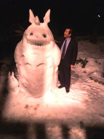 先日お伺いしたお客様のお庭にはトトロの雪だるまがありました。自宅の灯りでライトアップされています。そばに立ってみると人の背丈を越えたかなり大きいもの。今月6日大雪が降った翌日、お客様の友人がやって来てお昼から半日かけて二人で作ったものらしい。これまでもいつくかの雪だるまを作ったそうですがトトロ系が多かったと。どうもお客様の友人のお好みらしい。お二人とも年令は50才。