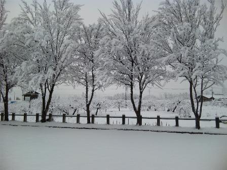 今朝、燃えるゴミを収集場まで持って行こうと外に出ると、久しぶりの雪景色。湿気を含んだ雪の重さを感じながら公園まで来ると、木々の枝には綿のように雪が積もっています。その向こうにはやはり雪を乗せたリンゴの木が。白い景色の美しさにしばし見とれていました。これは写真を撮らねばと家に戻り携帯を持ってきてパチリ。気温も高いのでしょうが、それ以上の温もりを感じさせてくれる雪景色です。