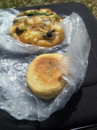 昨日は気温がグッと上がり、いままでつぼみのままじっとしていた桜が開きはじめました。街中のいたるところで桜が開花。これは花見をしなければと、お客様の店に入ると「今日は青菜漬のオヤキがあります」と、さっそくそれと野菜ピザ風パンを買って近くの公園に行きました。桜の木の下ではオバアチャンたちが食事をしていました。その隣に座りバッグをテーブルに青菜漬のオヤキをいただきました。