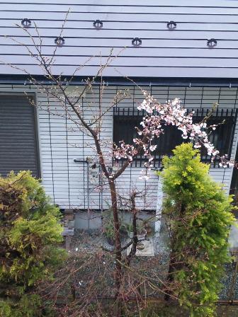今朝、自宅の2階の戸を開け下を見ると桜が咲いていました。隣家との堺に植えたモミジの隣から芽が出てきてアレヨアレヨと言う間にモミジよりも太い幹になったもの。あまり大きくならないように定期的に大型剪定をするため一部の枝しか残らないのですが、そのY字に残された一つの枝に今年の桜がいっぱいについていました。今日の気温はまだまだ冷え冷え状態なのですが待てなかったのでしょう。