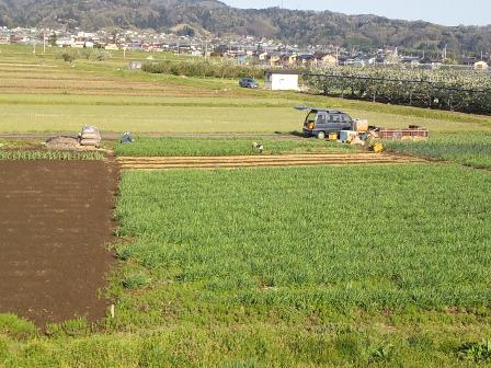 本日は快晴の土曜日。今日から植木市です。出店の商売の人たちは花見の時期の寒さで売り上げが上がらず大変だったよう。三日間晴れてくれれば何とか挽回できるのでは。などと考えながら朝の散歩をしていました。いつもの土手を通っていると、「始まりました」。ニラの摘み取りが。ご夫婦で毎日早朝に作業をしておられます。ニラもだいぶ育っています。サクランボ収穫の前まで毎日続けられます。