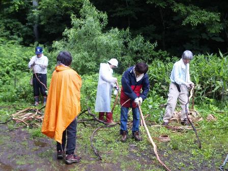 昨日の日曜日、友人達と山に入り山ブドウのつるを取ってきました。カゴを編むための材料にします。ブナやナラの木に沿って伸びている山ブドウの木をなるべく上から切るのですがなかなかの重労働。それらから皮を剥ぎ取ると真っ白い木肌が出てきます。必要なのはその皮。それらを裏返しながら丸くまとめてヒモで縛ります。それらを乾燥させるため自宅ベランダにつるすのですがそれが結構アート。