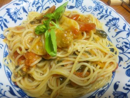 昨日の夕食はスパゲティー。自宅菜園のトマトを使ったらしい。今はトマトの最盛期。連日ボールにいっぱい収穫されます。先日、料理番組で有本葉子さんが自家製トマトソースの作り方をやっていました。オリーブオイルで炒め適度につぶすだけ。かなり簡単。それらをやってみたものらしい。帰りが遅くなり、空腹だったため一気に食べてしまいトマトソースの味がどうであったのか定かではない。
