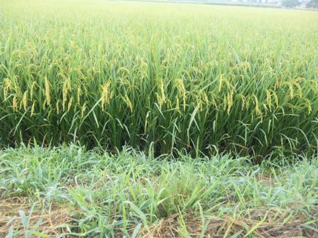 今朝、オレンジ色の太陽が山の上に出てきたのを見ながら、いつもの散歩コースを歩いていると、稲がかすかに黄金色に色づいているのがわかりました。穂も重さを増してきているのでしょう、ピンと空に向かって立っていたのですが頭を垂れはじめました。コウロギが鳴声を上げ、雑草の葉っぱの上には銀色の水玉がポツポツと。暑さに気持ちを奪われがちですが確実に季節は秋にシフトしているようです。