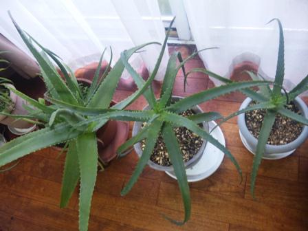 写真は室内に運び込まれたアロエ。10数鉢が家の中に。