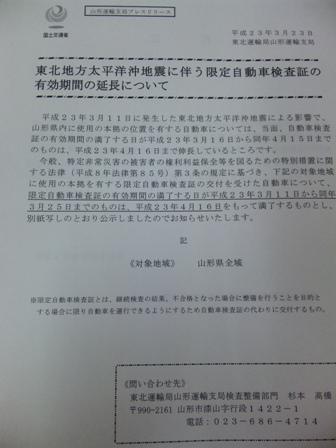 先日(3月26日)に国土交通省東北運輸局より今回の震災により山形県内に本拠の位置を有する自動車の車検有効期限を4月16日まで延長する旨通知が出されました。宮城県や岩手県、福島県など13の県ではすでに3月14日付で1ケ月延長が出されていたもの。山形においても部品等の調達がスムーズにいかず追加された模様。