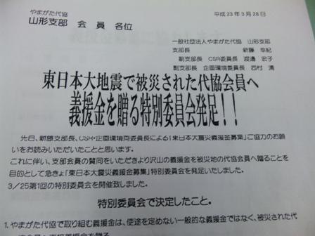 昨日、損害保険代理業協会山形支部にて会員への支援金を送るための打合せが行われました。被災地で保険代理業をしている人たちは、自分の事務所が倒壊し、その復興業務やお客様への保険金支払手続きに奔走しています。それらに加え、建物や自動車が消失したためにそれらに付けていた保険の解約の手続きも多数発生しているとのこと。その困難な状況は容易に想像することができません。