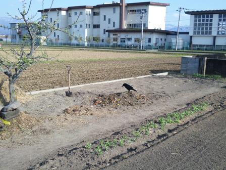 5月の連休は畑仕事が始まります。EMボカシをたっぷり入れたコンポストも10個ほどたまっています。今回は実家の畑の片隅を使わせてもらい土と混ぜ合わせ土壌作りをすることに。コンポスト4個分をあけて土をかぶせしばらく寝かせることに。ところがである、それを見ていた一匹のカラスがさっそくやって来てその上にのぼり、口ばしで中をほじくり出し始めたのです。カラスめ!なんてことするんだ。