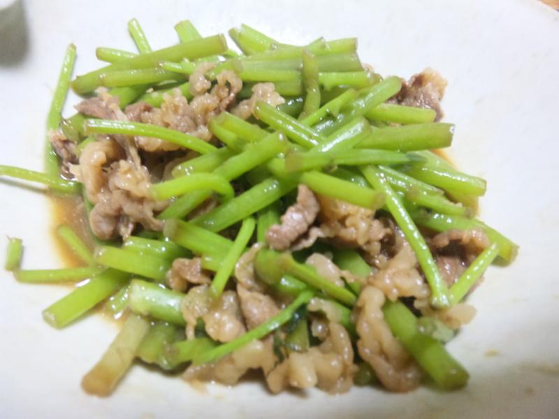 先日いただいたミズを如何に食するかを考えました。味噌汁に入れるといってもそんなになくなるわけでもなし。とにかく葉っぱをとり適度な大きさに切り、一旦ゆでたものを油で炒めてみました。何の味わいもないので牛バラを入れ一緒に炒めたところ。なかなか相性がいい。しょうゆで味をつけそれをご飯に乗せて食べてみると吉野家の牛丼の数段上のレベル。ミズのおいしい食べ方を発見しました。