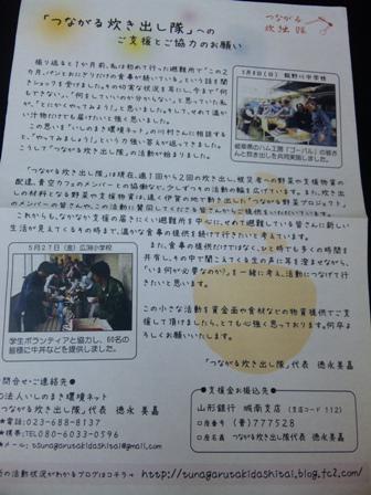 昨日ご来店いただいたお客様は、震災被災地への物資の輸送や炊き出しをやっておられます。これまでに10数回訪問しています。3ケ月を過ぎましたが避難所生活をしている人たちも多くおられるよう。同じものばかりを食べる生活をしている人たちも多いのだそうです。奥様も一緒に活動。現地のNPOの人たちと意気投合し「つながる炊き出し隊」を作ったのだと。今週末再度炊き出しに出かけるそうです。