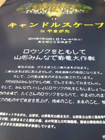 昨日お伺いしたお客様は数年前からキャンドルナイトのイベントを実施しておられます。「ろうそくを灯してゆったりとした夜を過ごそう」というのがコンセプト。今、注目度が上がっているようです。昨年までのサブタイトルは「省エネ大作戦」だったのですが今年は「節電大作戦」になったと。これまでは業界の反発で使えなかったネーミングだったのですが今年は電力事情もありクレームは来ないそうです。