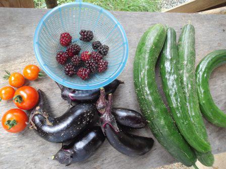 今朝、畑をのぞいてみるとキュウリが結構な大きさに。ナスも何個か。今年はトマトをプランターに植えたのですが実のつき方は少なめ。やはり地面に根っこを充分に伸ばせるようにしてやったほうがよさそう。肥料をやればいいのかな?その辺は全くの対策なし農法です。ブラックベリーも今年はどうも甘みが少ない感じです。とはいえこれだけの収穫があると朝食用には充分。ナスは即席塩もみで食べました。