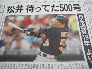 昨日車でラジオを聞いていると松井が日米通算500号のホームランを打ったというニュースが流れてきました。大リーグに行って9年、アメリカでも168本のホームランを打ったのですね。スバラシイ。松井応援団としては最近話題が少なくなっていたのをさみしく思っていましたが快挙にスッキリした気分です。長島さんのコメントがよかった。「500号は通過点、これから600号、700号目指して欲しい」と。