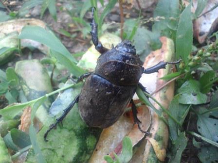 昨日は早朝から庭の草取り。畳4枚ほどの畑の草も伸び放題。鎌で土を掘りおこしながら草の根っこから引き抜く作業はなかなかの労働。1時間もすると太陽の日差しがきつくなり終了。生ごみとして捨てるには水分が多すぎるため畑の片隅に乾燥させていたスイカの皮をひっくり返すと、なんとメスのカブト虫が一匹。よくも探してやってきたものである。スイカの皮と一緒に木陰に移動してやりました。