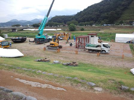 昨日、馬見ケ崎川沿の道を通ると、河川敷にクレーン車がアームを伸ばし作業が進められていました。今月4日に開催される『日本一の芋煮会』の準備です。鉄板が敷かれその上にL字コンクリートで作られた直系6mもあろうかという大きなカマド。となりには例の大鍋が。3人ほど中に入って掃除をしていました。関係者はモクモクと作業をしていました。台風が日本海にぬけてくれればいいのですが。
