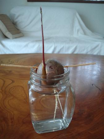 窓辺に置かれたアボガドが芽を出し始めました。妻がどこかで聞いてきたらしい。アボガドの水栽培方法を。食べ終わったアボガドの種に両側からつまようじを刺し、種の下部が水に浸るようにしておいたもの。1ケ月ほどたった時に下から白い根っこがでてきました。それから数週間すると種が割れて中から芽が出てきたのです。今は4〜5cmほどに伸びています。はたしてこれからの成長はいかに。