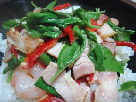 昨晩の夕食はバジル丼。最近の我家の人気メニューです。ベーコンとピーマンをニンニクとトウガラシと一緒に炒め、程よいところでスープを入れ、味付けはニョクマム。出来上がる寸前にフレッシュバジルをたっぷり入れて一煮立ちさせます。それらを白いご飯の上にかけて完了。バジルの香りとニョクマムのヒトクセあるあの臭いの相性がバツグン。20分ほどで出来上がるスピード調理であるのも魅力です。