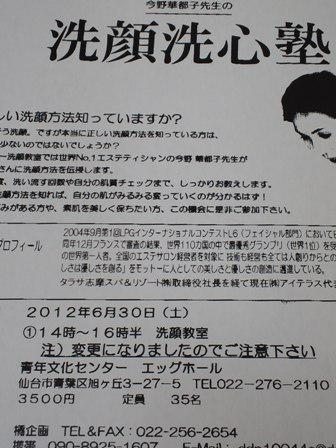 先日、今野華都子先生の洗顔教室の案内がFAXされてきました。6月30日に仙台市内で開催される模様。会社経営を洗顔から学ぼうと、先日初めて洗顔教室に参加したのでした。ほとんどが女性だったのですが男性も3名ほど。女性の真剣勝負の場に足を踏み入れてしまったような感じも無きにしもあらず。しかし私のお客様の決定権は奥様であったりするわけで決して無縁ではないのかもしれません。