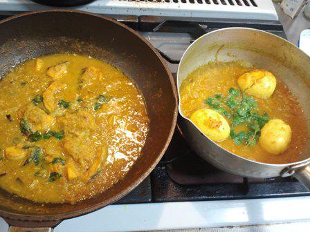 先日の土曜日、たらカレーに挑戦。鶏肉や豚肉のカレーは手馴れたものなのですが、魚のカレーはうまくいったことがありません。クミン、ターメリツク、コリアンダーを衣をつけるようにまぶし、油で炒めたものをニンニク、しょうが、たまねぎの摩り下ろしたものとミックスし調理。ついでに卵のカレーも一緒に。出来栄えは30%といったところ。翌日プロセスを変え再度たらカレーに挑戦。出来栄え70%でした。